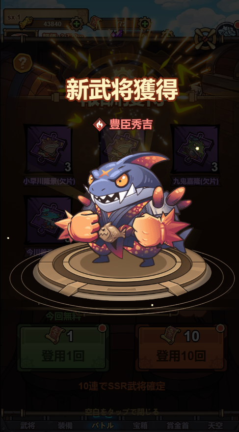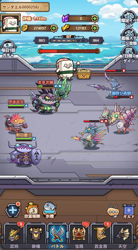 船長001《空戦 寿司王と共に戦う魚武将の征討記》はカジュアル放置系バトルゲームだ。プレイヤーは「寿司王」となり、個性豊かな“魚武将”たちを率いて宿敵との死闘に挑む。飛行船を守り、領地を死守せよ。