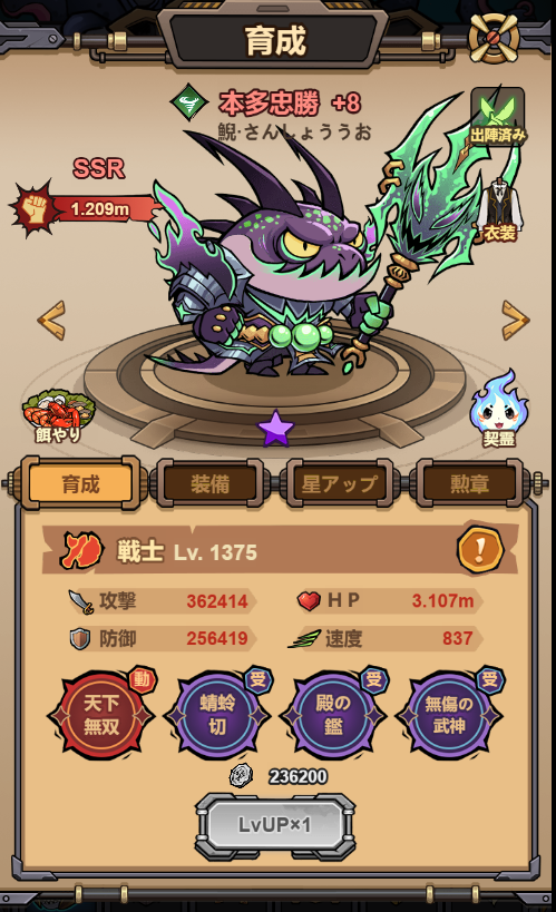 多彩な“魚武将”が集結。それぞれが複数のスキルを持ち、武将同士の組み合わせが勝利の鍵を握る。戦略的なチーム編成で戦局を制そう。