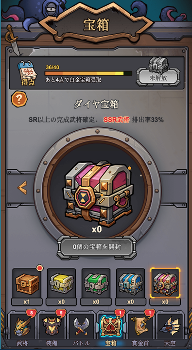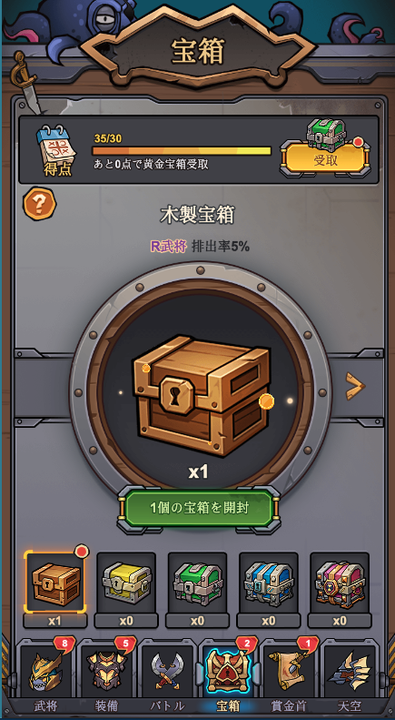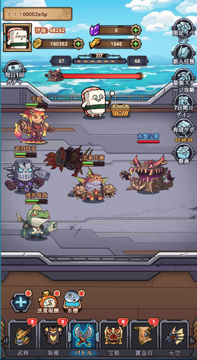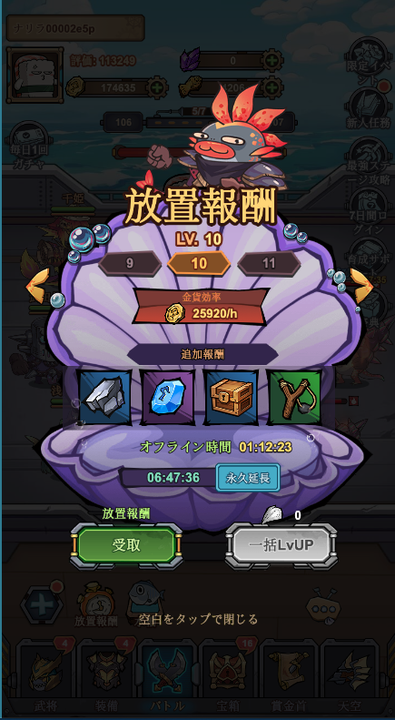 ゲームを起動していない間も、寿司王と魚武将たちは戦い続け、戦利品として宝箱をザクザク集めておいてくれます。