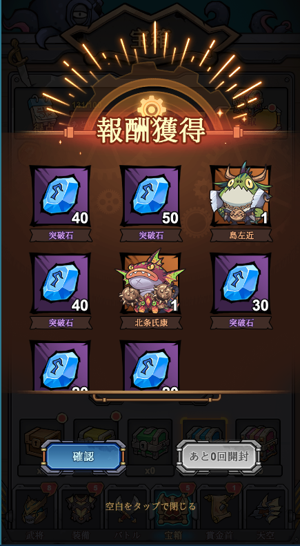 戦闘で大量にかき集めた宝箱を、一気に全開封する時の爽快感は、このゲームの醍醐味の一つです!