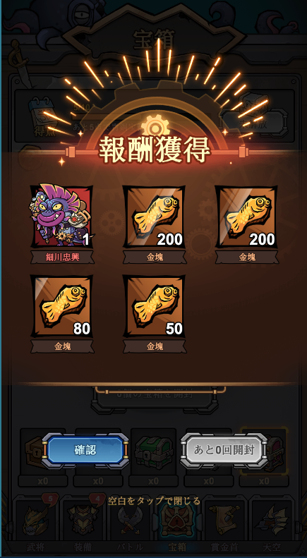 この宝箱こそが、大量の育成素材や、頼れる「魚武将」本体を入手するメインルートなのです。