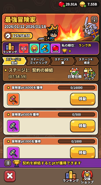 冒険家001「最強冒険家」は、期間中に特定の育成アクションを行うことで「冒険家pt」を獲得し、全サーバー共通のランキングを競うイベントです。