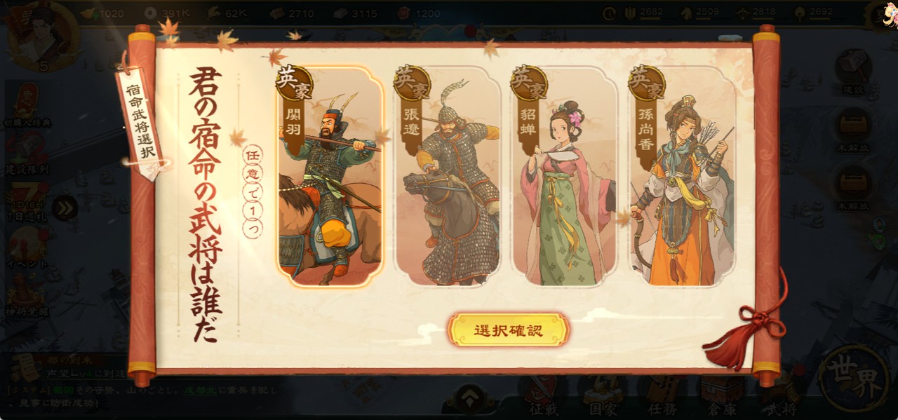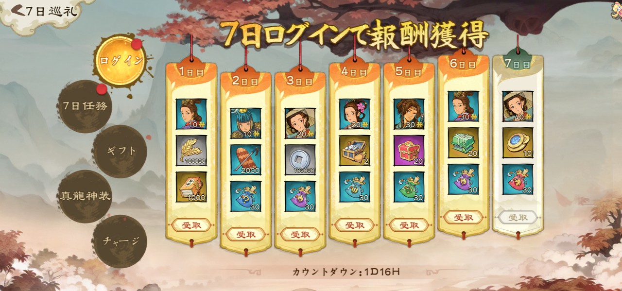 ゲーム開始直後に、関羽・張遼・貂蝉・孫尚香の中から「宿命の武将」を1名プレゼント。さらに7日間の連続ログインや任務クリアをこなすだけで、レアな資源や限定SSR武将が次々と手に入ります。序盤から圧倒的なアドバンテージを持って乱世に臨めます。