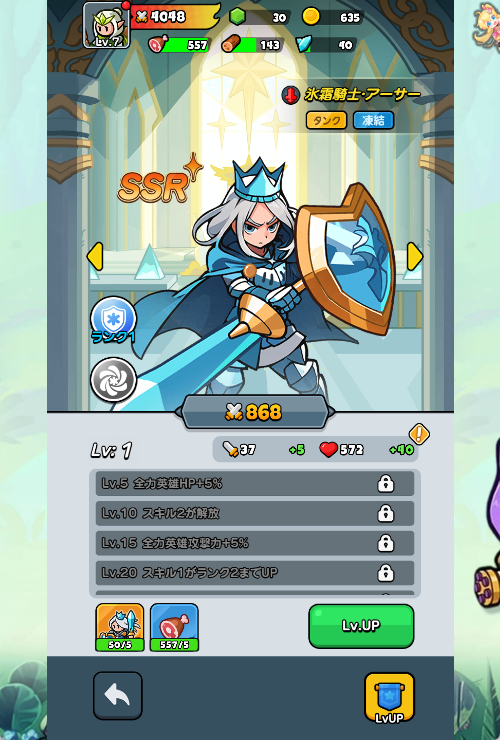 『ドンドコヒーロー』の最大の魅力は、その多彩な育成要素です。強力なSSR「氷霜騎士・アーサー」をはじめ、頼もしいヒーローたちがあなたの指揮を待っています。