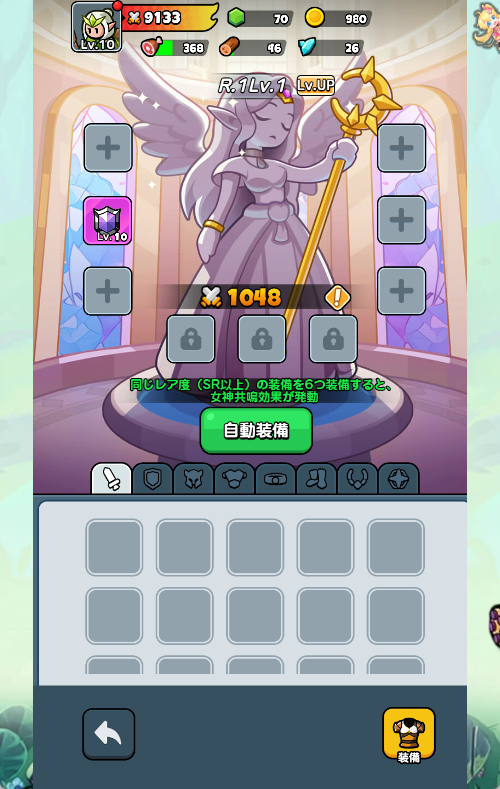 女神システム:武器や防具を装備させ、戦力を一気に高めます。SR以上の装備を6つ揃えると発動する「女神共鳴効果」は必見です。